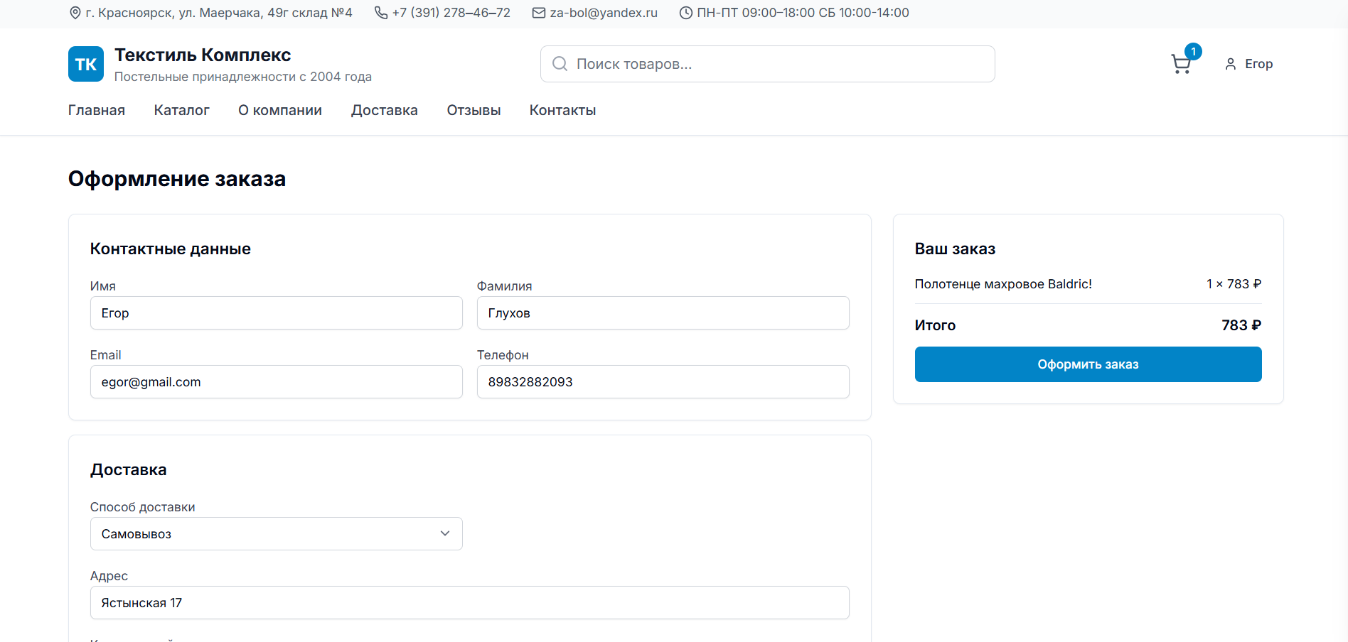 Интернет-магазин для дистрибьютора текстильных изделий